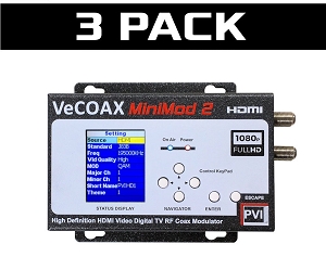 3 PACK - 3 UNITS SPECIAL PRICE - Distribute any HDMI Video up to 1080p Full HD & Dolby Audio, to an unlimited number of television over the existing TV Coax Cables, with perfect FULL HD 1080P digital quality at any distance. There is no need for any new cables nor accessory behind each tv, so the installation is very simple, immediate, plug 'n play anywhere, perfect for any application. Set the wanted channel names & position numbers, then rescan all TVs to find the VECOAX Channels as new available HDTV TV Channels. Expand the number of channels at any time by simply adding more VeCOAX modulators on the same coax. The PVI VeCOAX HD Modulators are compatible to any HD Video Source & HD Television, limitless, Made in USA with Free Unlimited Tech Support and 5 Year Warranty.